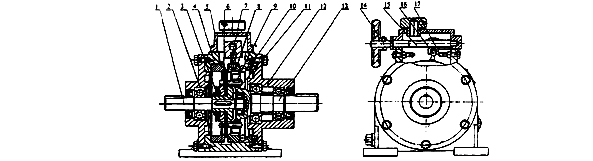 1、输入轴 2、输入法兰盘 3、碟形弹簧 4、箱体 5、固定摩擦环 6、太阳轮压紧盘 7、锥形摩擦盘 8、移动凸轮 9、滑快 10、固定凸轮 11、太阳轮 12、输出法兰盘 13、输出轴 14、手轮 15、调速螺杆 16、拨头 17、调速螺母 |