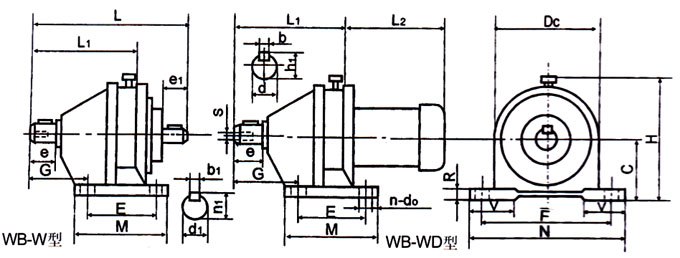 b、双级减速比机型有E、WBE1065型、WBE1285型、WBE1510型。其减速比分别有:121、187、289、385、473、595、731、989、1225、1849。